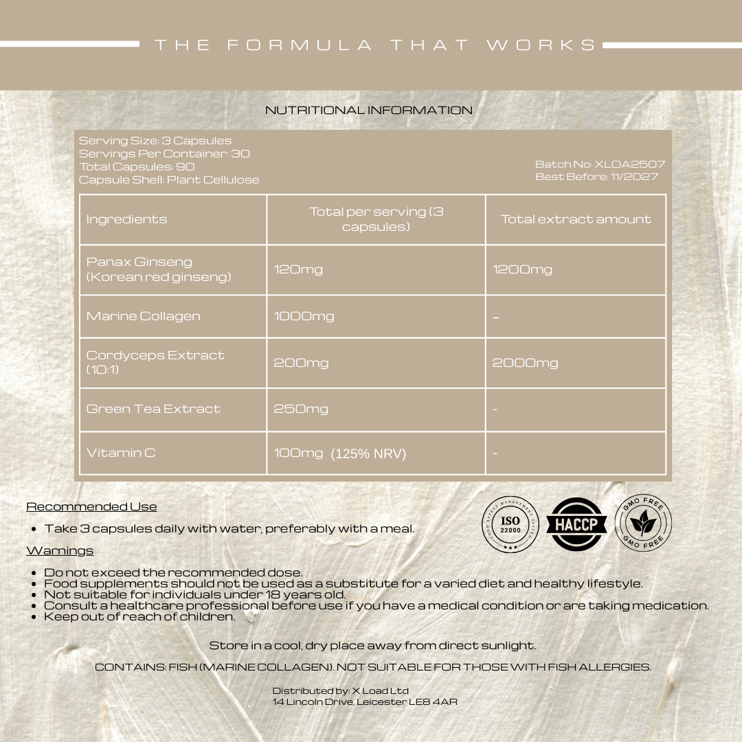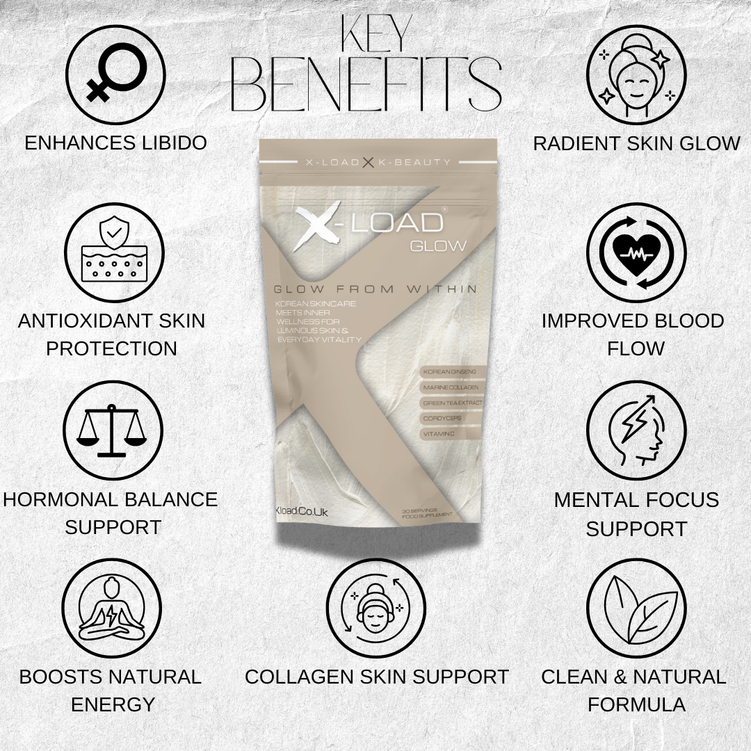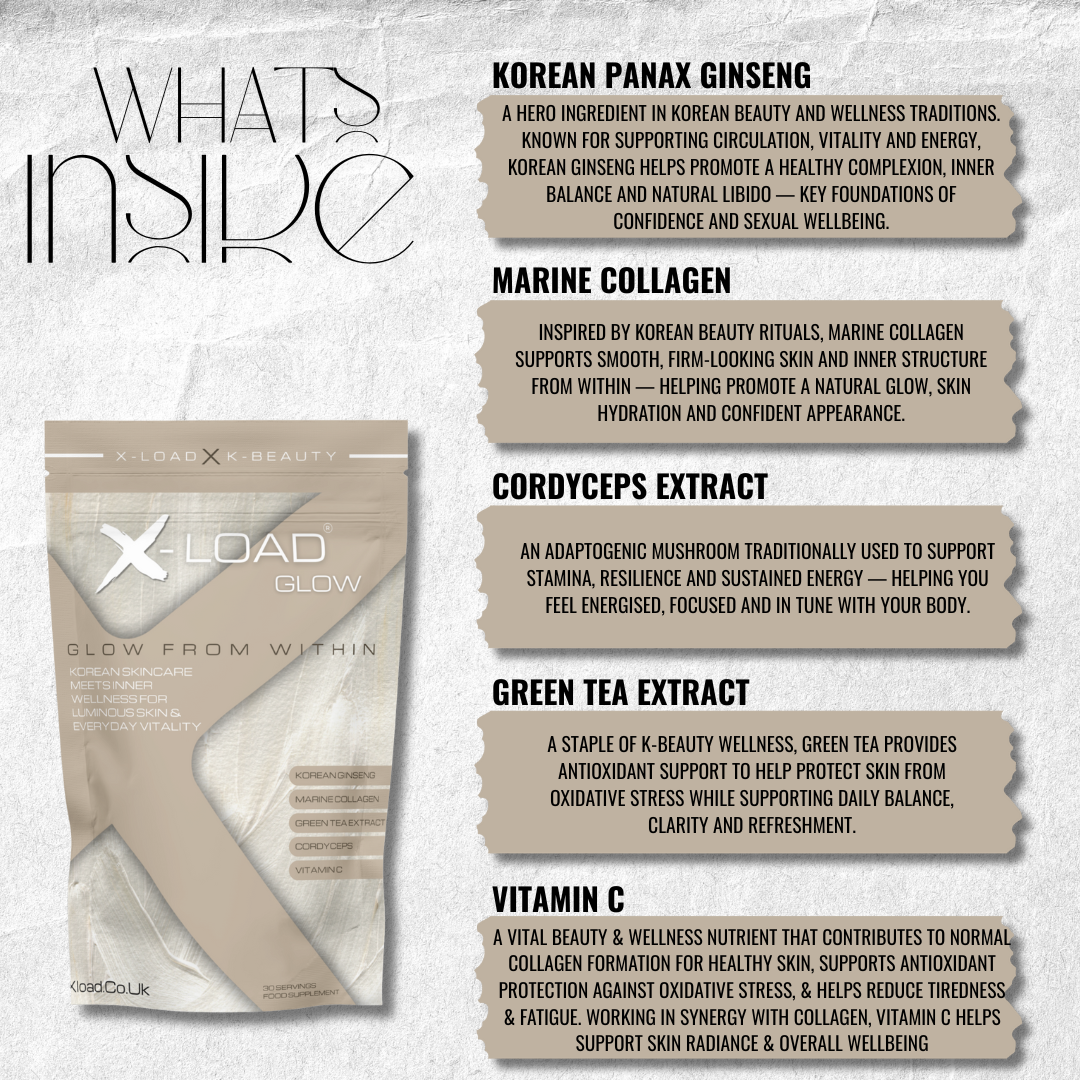 Why choose X-Load Glow: Korean skincare–inspired beauty-from-within formula Supports skin radiance, elasticity, and vitality With Marine collagen, Korean Panax ginseng, green tea, cordyceps & vitamin C.